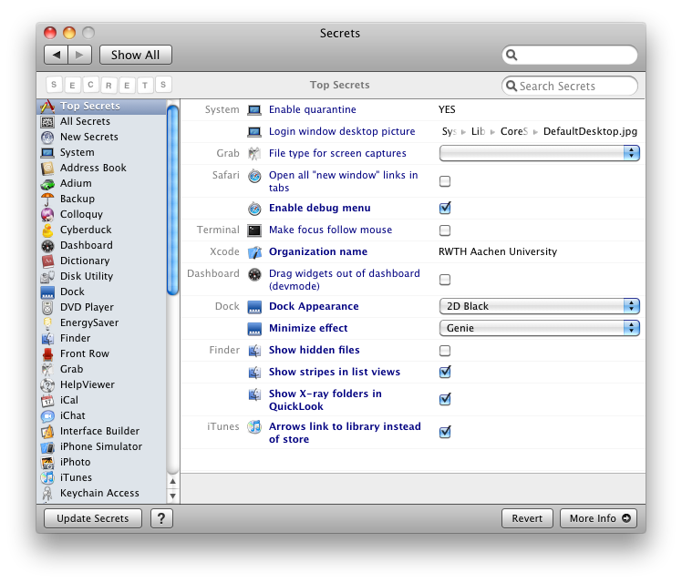 Many Mac applications offer user defaults settings, that can not be configured via the graphical user interface. To edit them, the defaults command on the Terminal has to be used. These settings often exist for testing or debugging purposes, but some of them are actually quite useful. Secrets is a website that collects these hidden settings in applications. They also offer a preference pane, that allows setting the preferences easily via a graphical interface. The preference pane synchronizes with the website to make sure you can always select from the latest set of available settings.