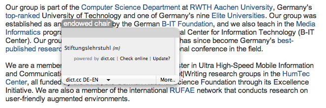 Be aware, that the overlay will only display the results for the first reference source of the Dictionary app, which has an entry for the word under your mouse cursor. So if you want to use the dict.cc plugin with the overlay, you have to open the Dictionary App, go to Preferences and drag the dict.cc entry to the top of the list.