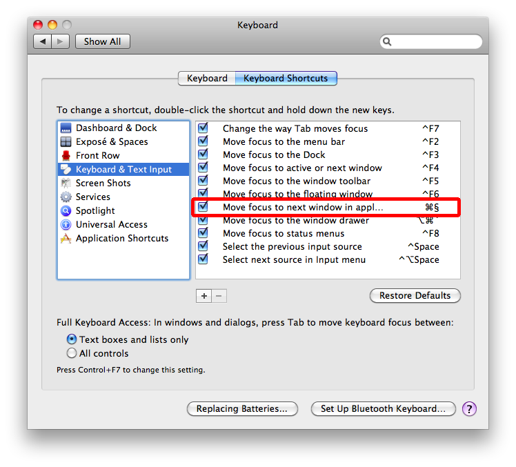 As probably everybody knows, you can cycle through your open applications by pressing CMD-(SHIFT)-TAB. On an english keyboard you can do the same with the different windows of one application, if you press CMD and the key above TAB and left to 1. However, the default shortcut of Mac OS X won't work if you've got a german keyboard, a german keyboard layout or the USGermanKeyboard. So if you want this behavior on the key above the TAB-key, you've got to change the key for 'Move focus to next window in application':