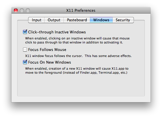 If these options don't exist on your system, than it's quite likely that your X11 Window Server is out of date. You may find an update on Apple's website, but you can also use the X11 packages from the XQuartz project, which are more up to date than the ones Apple provide. After installation and a new log-in, XQuartz is used as X-Server. Configure as described above, or if you don't like searching preference dialogs, simply open a Terminal and type in the following two lines, which will have the same effect: