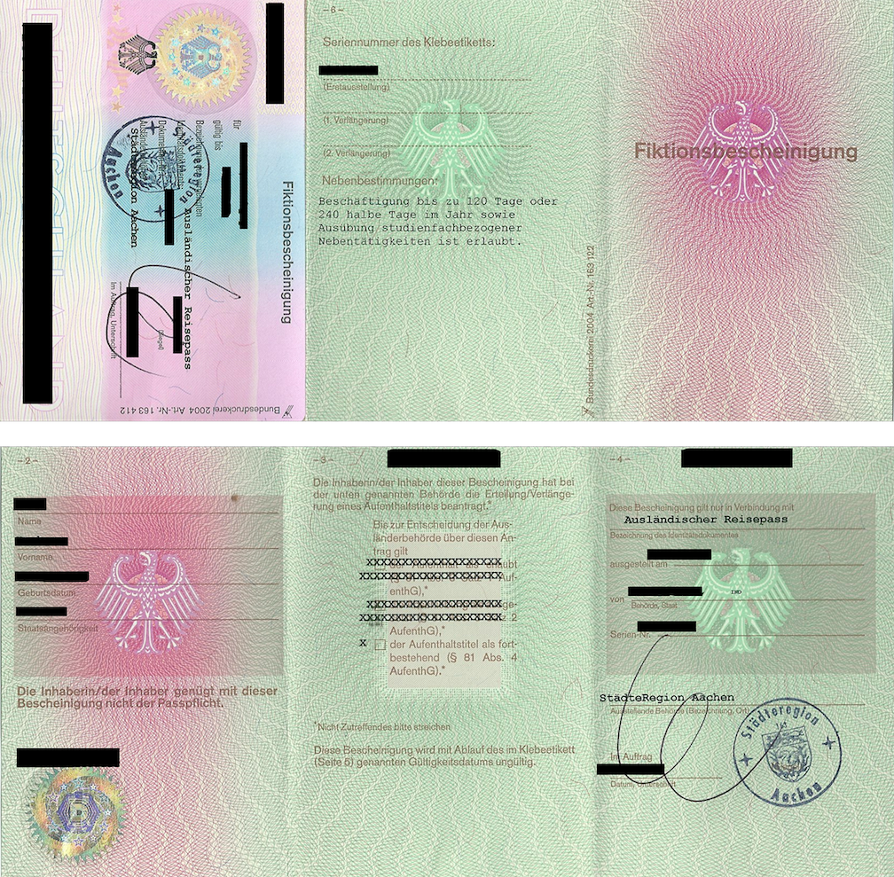 - Fiktionsbescheinigung (Kashyap Todi): If you want to extend your visa for a short period (≈one semester), there is also an option to obtain a 'Fiktionsbescheinigung'. This works pretty much in the same way as a residence permit, but has the benefit that it is cheaper—it costs approx. 20 EUR. The same documents, listed above for visa extension, are required for this too. Reasons to get a Fiktionsbescheinigung include extending stay to complete studies or thesis (I need to confirm the maximum duration for which such an extension is possible—will try to get this info when I go there again). A sample image of the booklet received from the office is available here: Fiktionbescheinigung Template